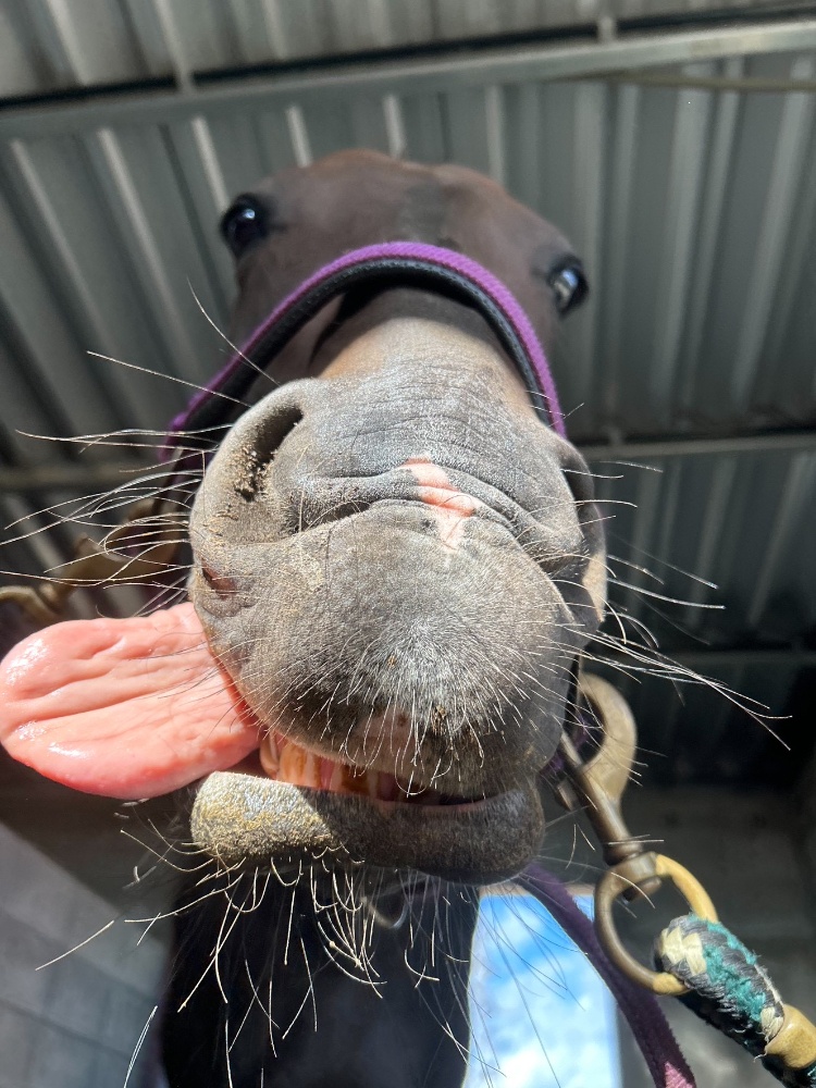ちゅらん自慢のサラブレッド、スパークルメノウくんの紹介です。スパークルはかの有名なディープインパクト産駒で、父親譲りの品性と風貌がある一方でユーモアたっぷりのひょうきんな一面を持ち合わせています。ペコちゃんのように下を横に出す表情やおっとりマイペースな性格からは競走馬時代に大活躍していたことを感じさせない程です。ちゅらんにいらした際はぜひ撫でてあげてくださいね!