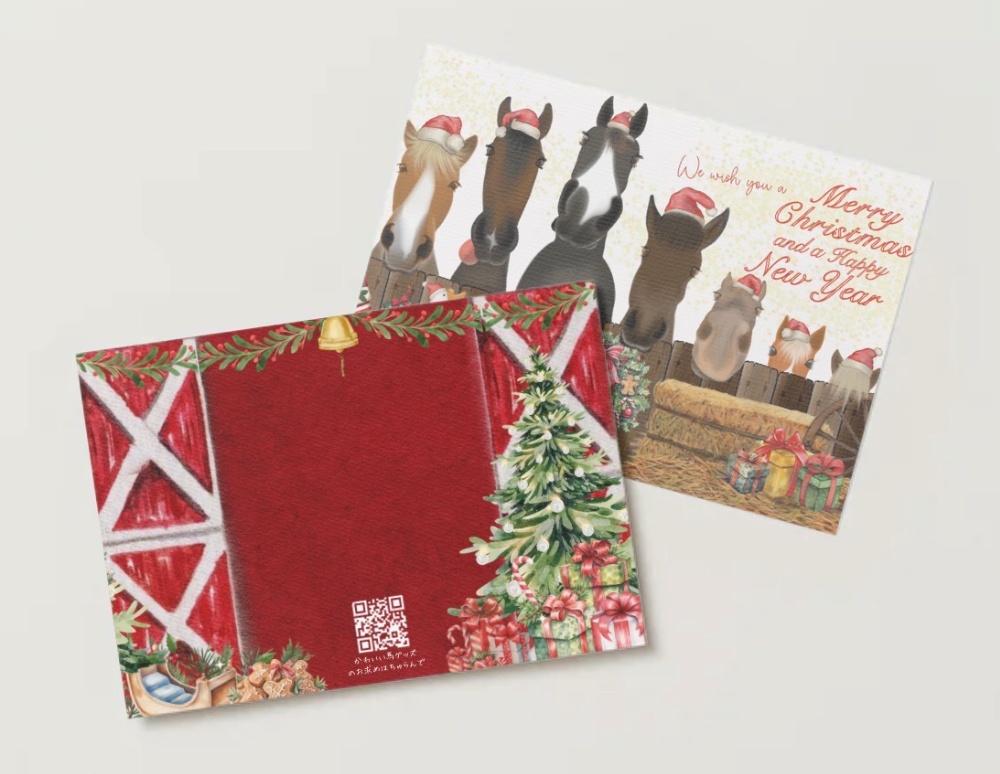 クリスマスカードを作りました♡厩舎の扉を開くと中の馬たちが現れる見開きタイプとなっております。枚数限定となっておりますので、ぜひお早めにお求めください。ただいま発注をかけてますので、実物が届き次第画像を増やしたいと思います。お楽しみに〜!